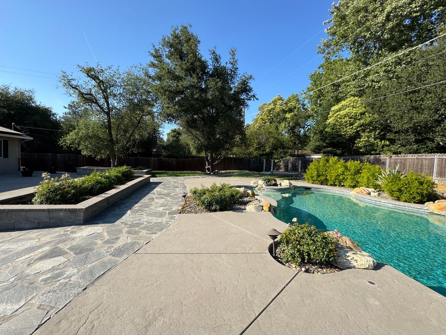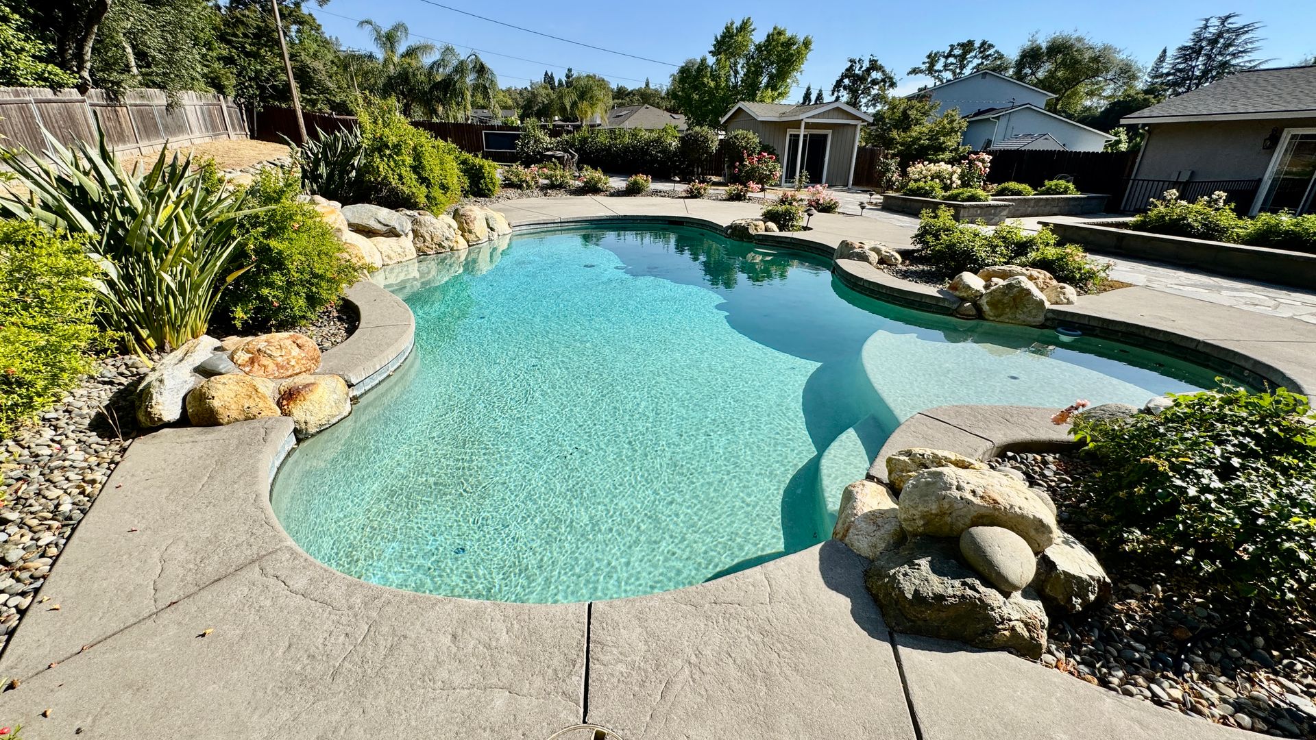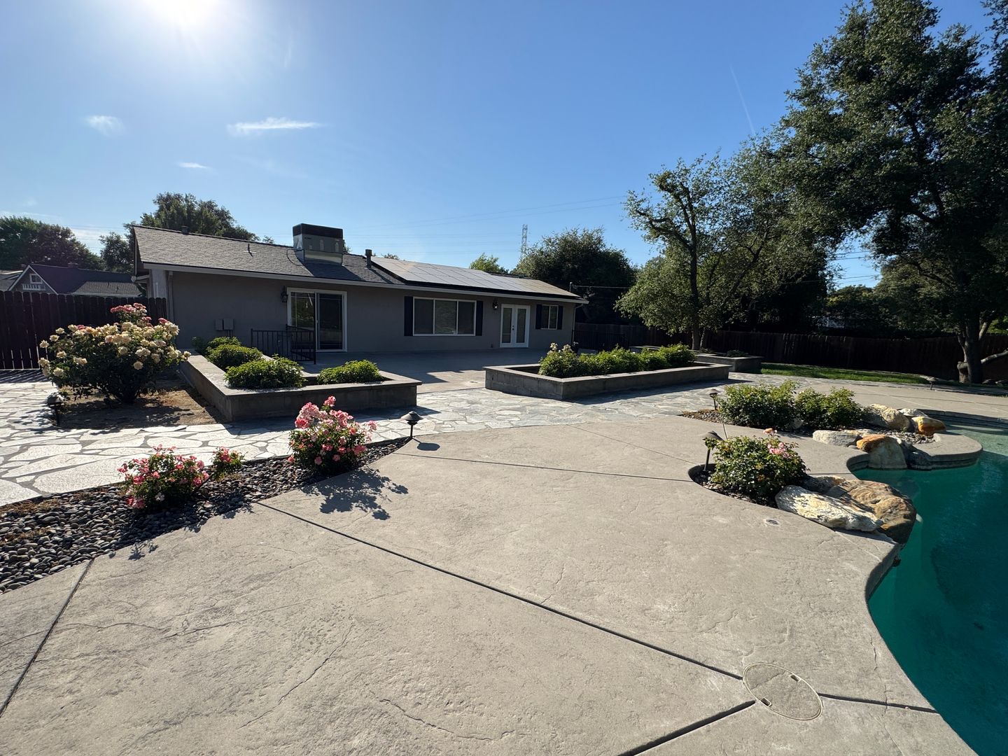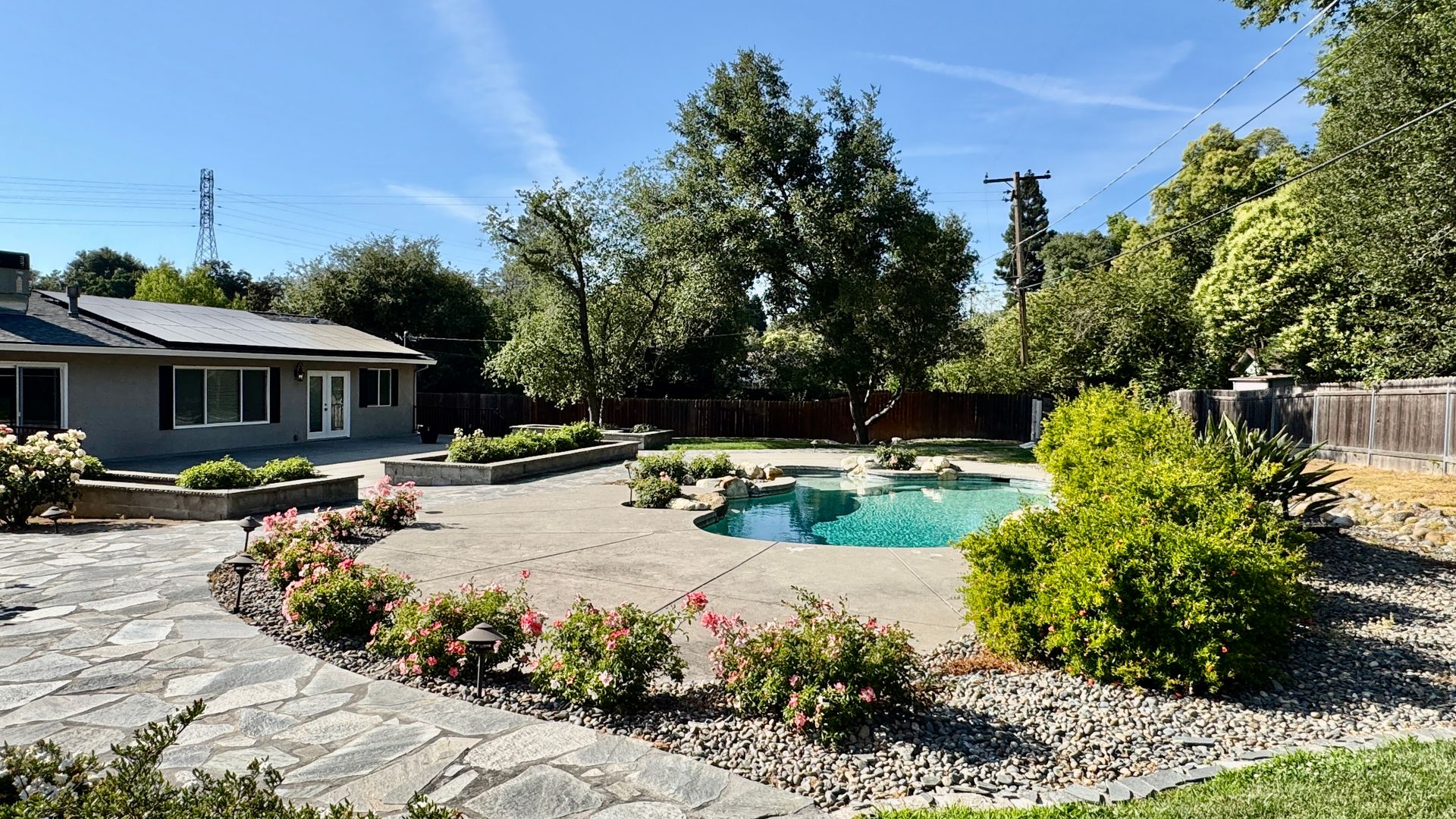 • Backyard: Resort-style with a built-in pool and spa, manicured landscaping, rose bushes