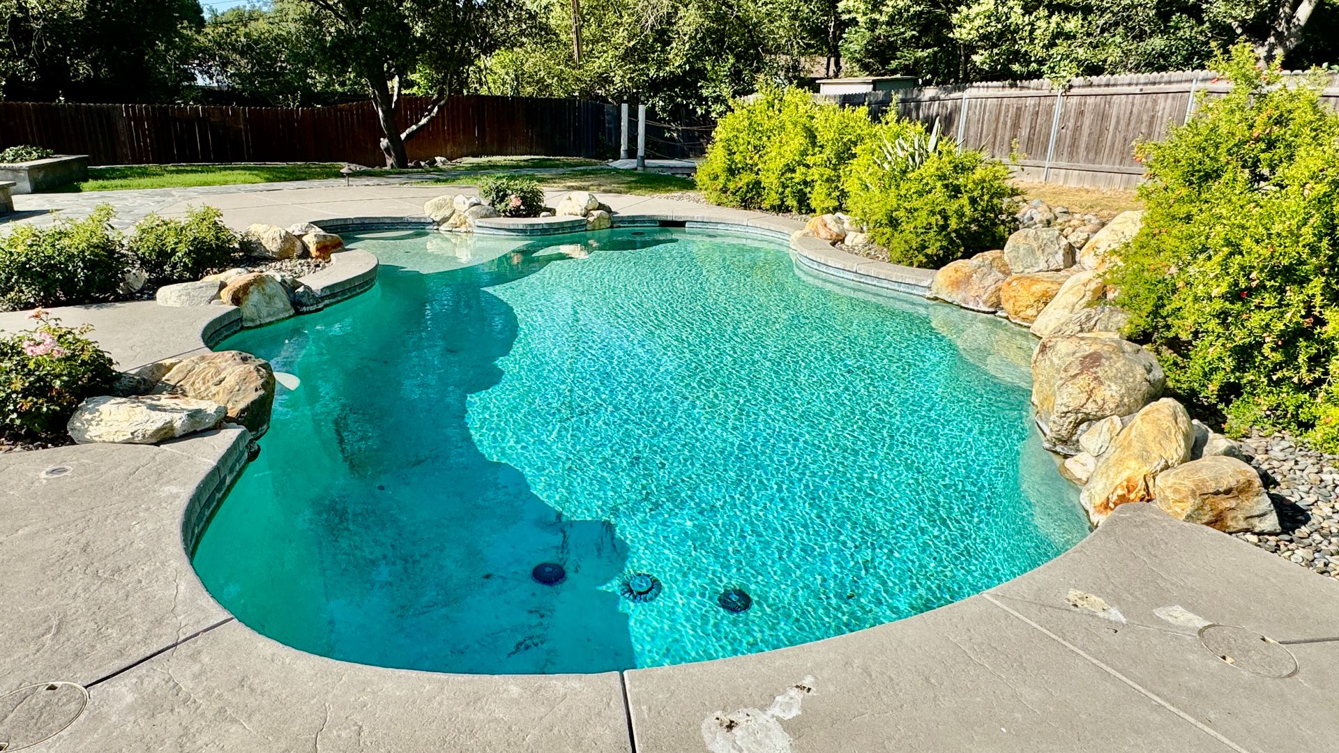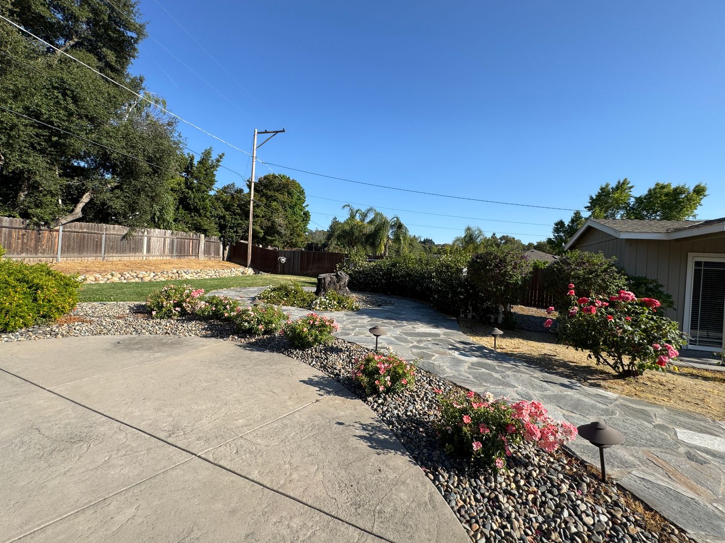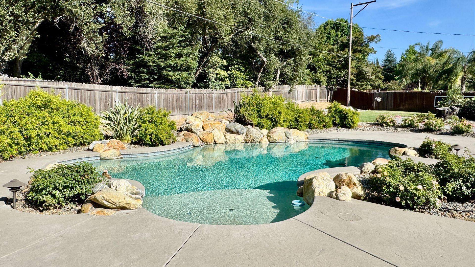 • Backyard: Resort-style with a built-in pool and spa, manicured landscaping, rose bushes