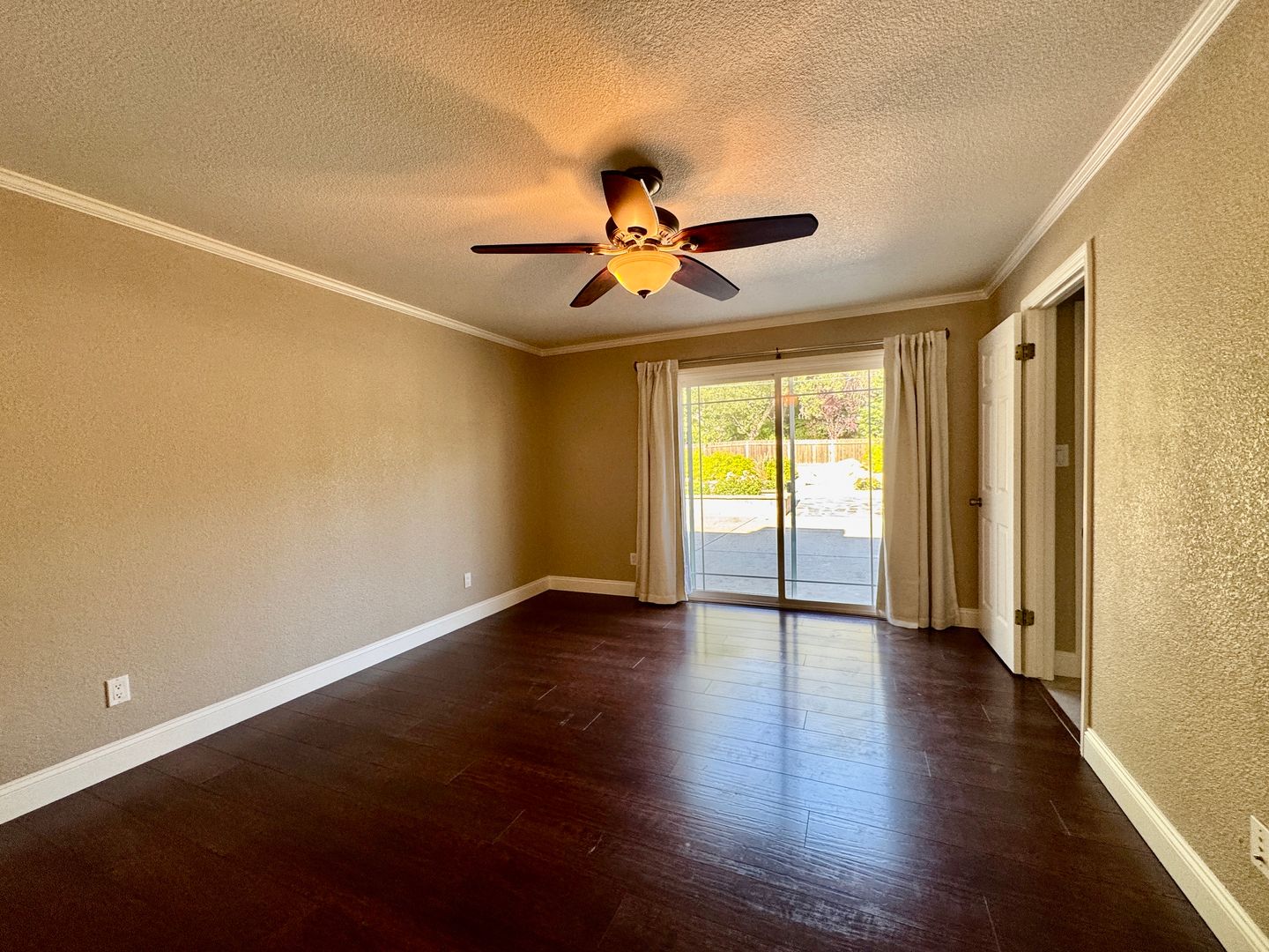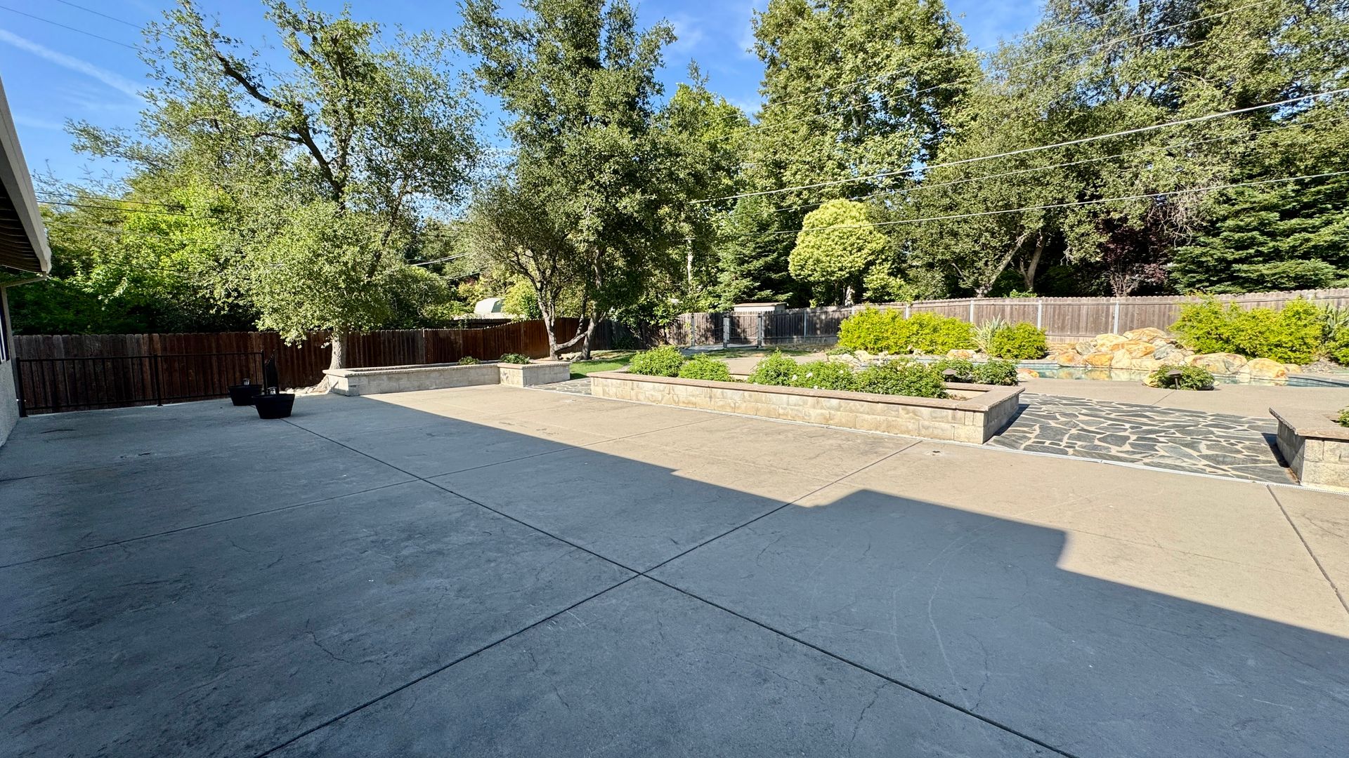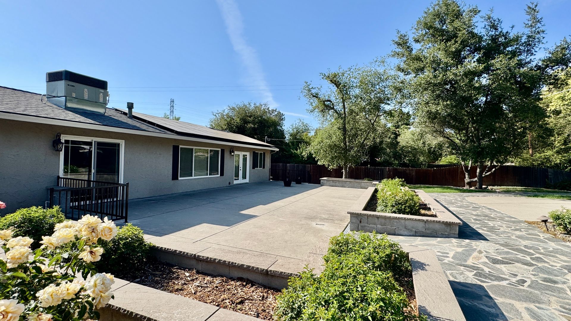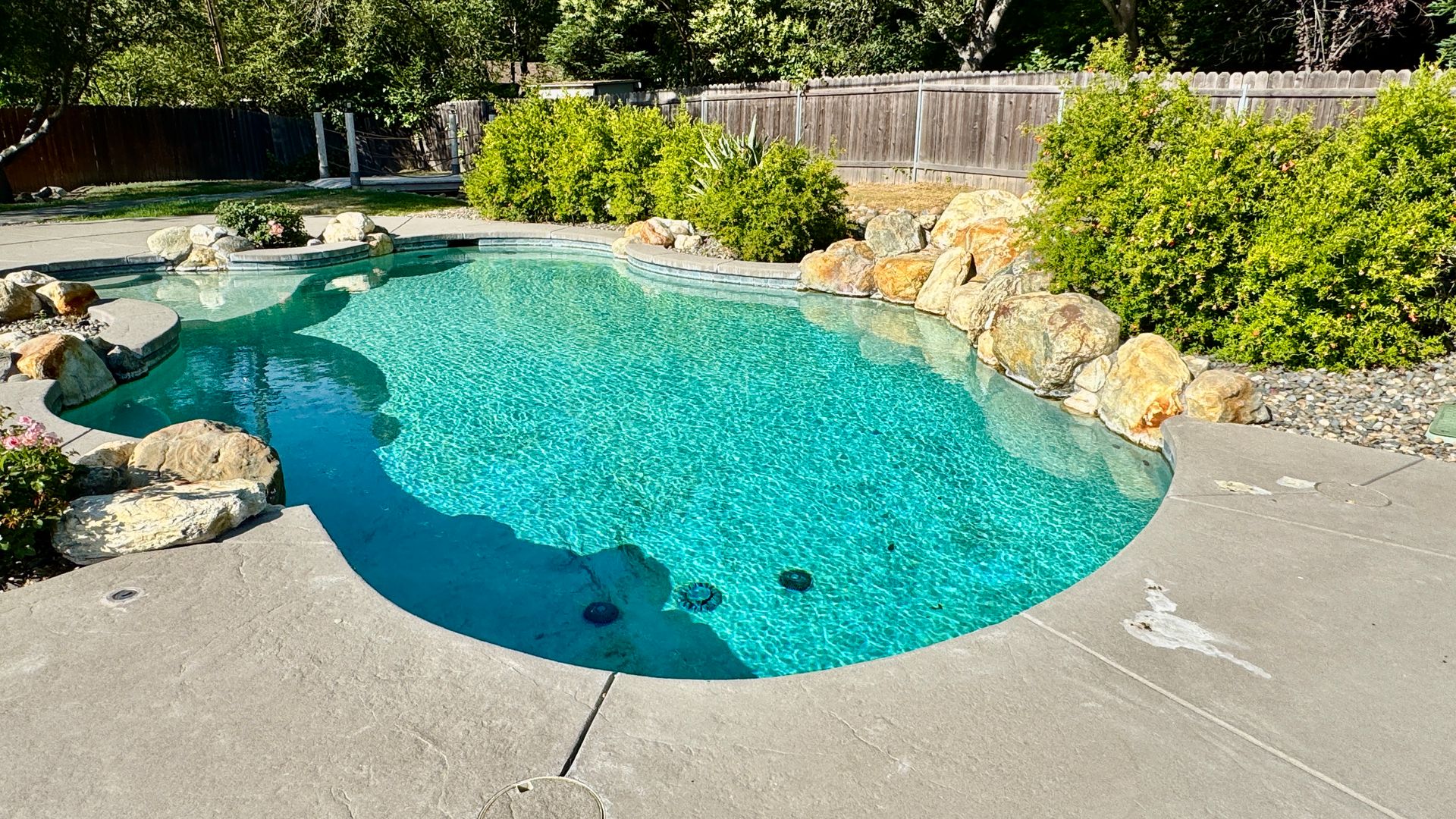 • Backyard: Resort-style with a built-in pool and spa, manicured landscaping, rose bushes