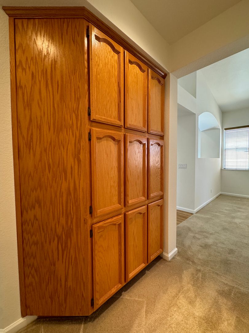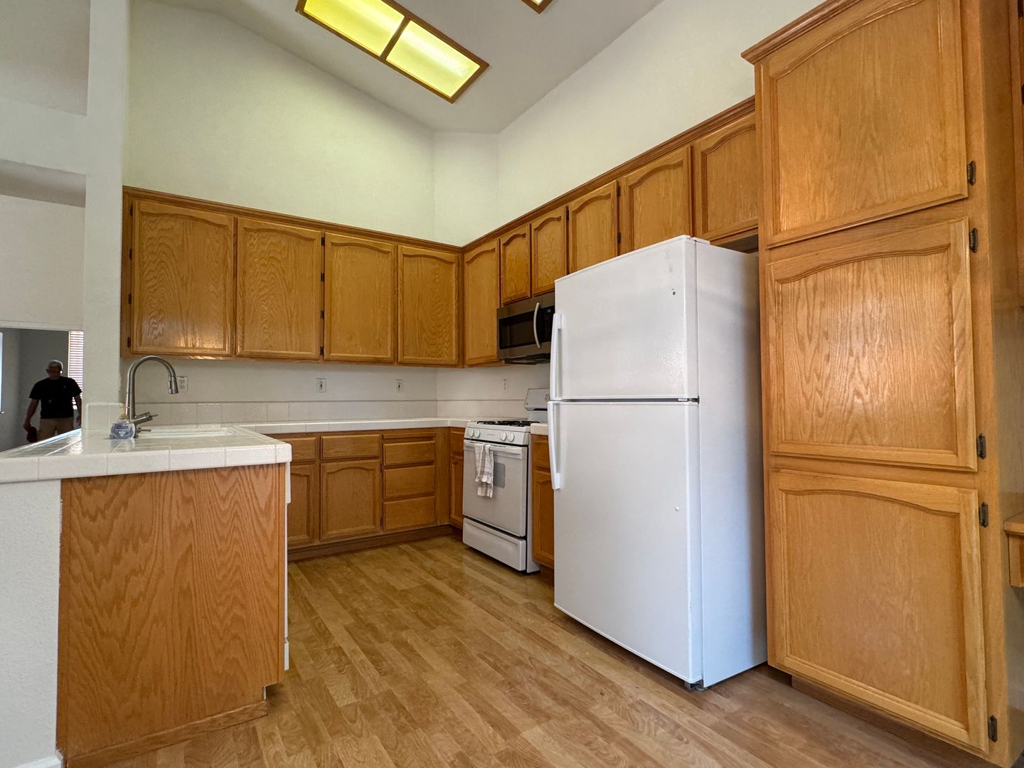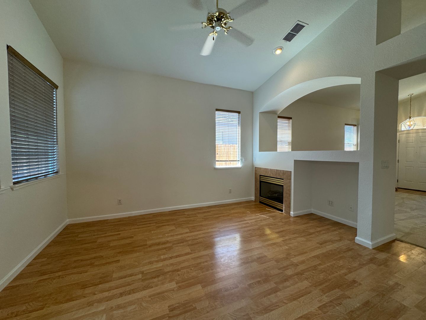 One story, 3 bed, 2 bath, formal living area with carpet, separate family room with gas fireplace TV niche and laminate floor, vaulted ceiling. Open kitchen plan with clean white tile countertops, warm oak cabinets, pantry cabinet, built-in desk, dining area. Primary bedroom with ensuite bath, dual sinks, shower over tub, and walk in closet. Inside laundry with cabinets. Low maintenance landscape. Tenant responsible for landscaping. Tenant required to purchase rental insurance.