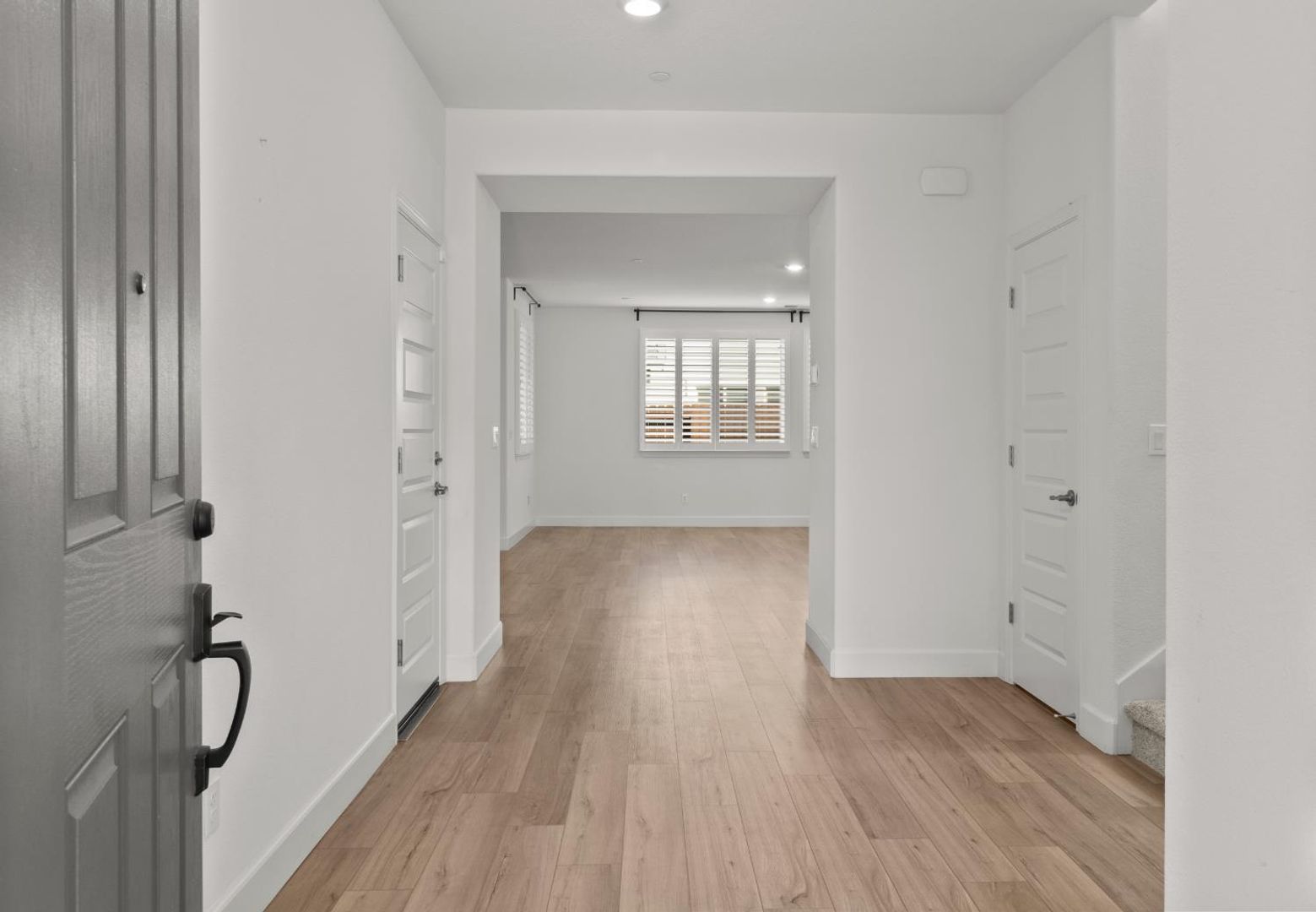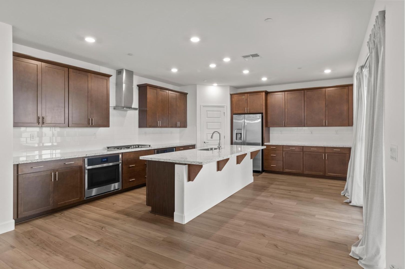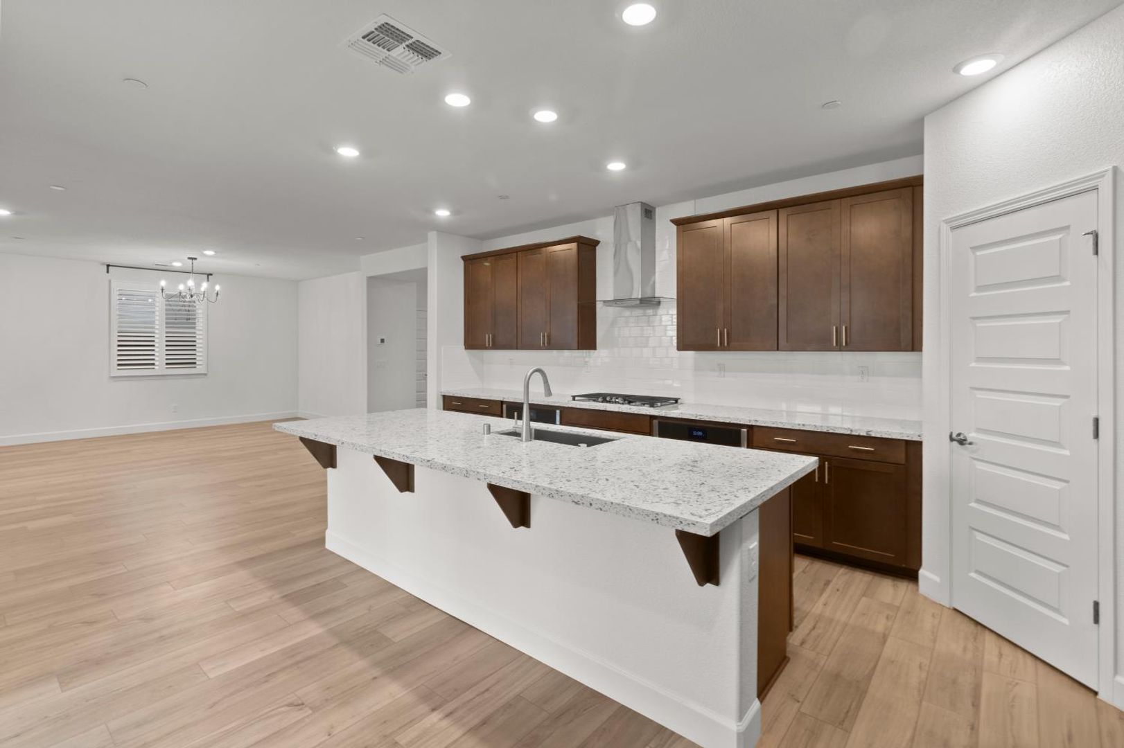 The light-filled main level features an open-concept living and dining area that flows effortlessly into the stylish kitchen, showcasing a large marble island with sink, pantry closet, and direct access to the covered patio—ideal for entertaining or relaxing outdoors. A first-floor bedroom and full bathroom provide flexible space for guests, multigenerational living, or a home office.