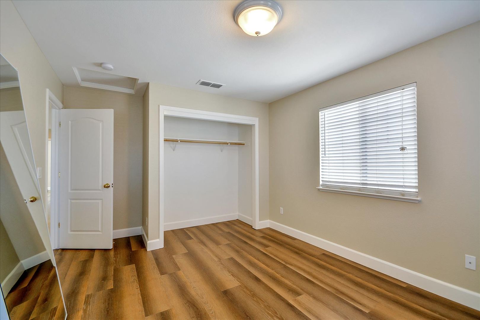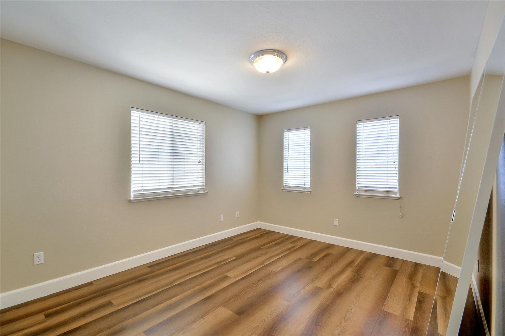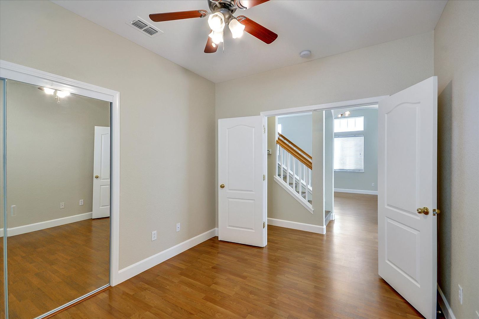 Downstairs bedroom with wood laminate floors and glass sliding mirrors. Full bath downstairs with new tile floors. Huge master suite with double door entry, walk-in closet, separate tub and shower, and dual sinks. Finished backyard with new grass sod and landscaping.